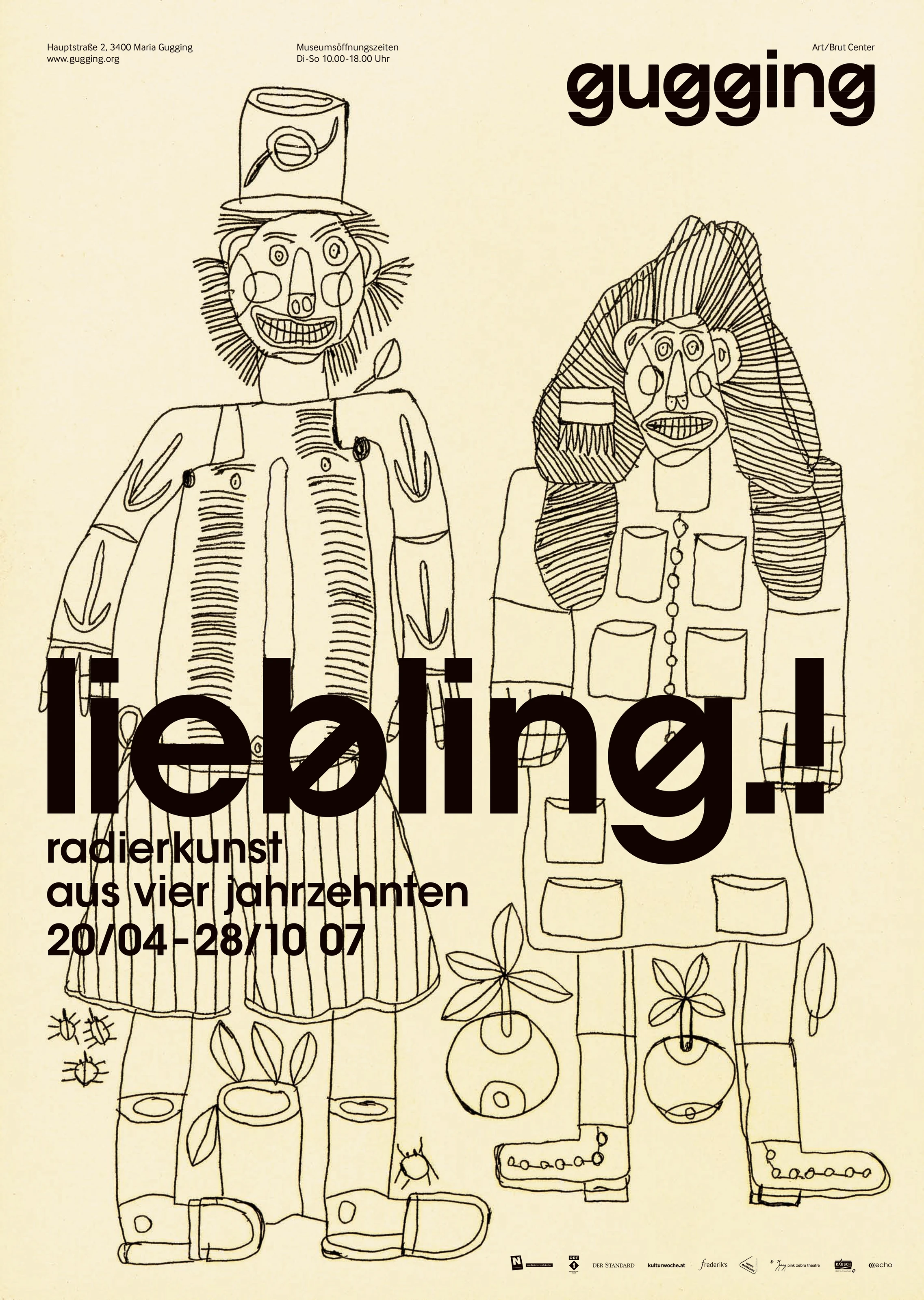 Die Technik der Radierung hatte in Gugging eine lange Tradition. Bereits in den Sechzigerjahren entstanden mit Unterstützung des Künstlers Peter Pongratz erste Radierungen. Leo Navratil gab seinen Patienten Kupferplatten, um diese mit einfachem Stichel zu bearbeiten. Die Gugginger Künstler*innen waren damals noch unbekannt und niemand glaubte daran, dass ihre Arbeiten die internationale Anerkennung der Kunstkritik finden würden. Bis in die Gegenwart ist die Druckgrafik ein Medium der Gugginger Künstler*innen geblieben, das in Form einfacher, unkorrigierter Radierungen gedruckt wird. Die Einfachheit der Radiertechnik in Gugging legt oft künstlerische Aspekte frei, die auf Farbstiftzeichnungen oder Leinwänden verborgen oder verdeckt bleiben. Zudem kann diese Feinheit des Striches mit keiner anderen künstlerischen Technik erzielt werden. Wird die Radiertechnik aufgrund ihrer festen Verankerung in der Kunstgeschichte und ihrer Reproduzierbarkeit nur selten mit der Art Brut in Verbindung gebracht, so verlangt dieses Medium vom Künstler*innen jedoch oft bildnerische Lösungen, die weniger „gekünstelt“ sind als viele Musterbeispiele der sogenannten rohen Kunst. Im Rahmen der Ausstellung liebling.! im Jahr 2007 wurden 196 Arbeiten gezeigt, darunter Raritäten der Gugginger Radierkunst von Oswald Tschirtner, Johann Hauser und August Walla, aber auch unbekannte Arbeiten, die der Öffentlichkeit erstmals gezeigt wurden. Nach der Präsentation blug – vier jahrzehnte kunst aus gugging war diese umfangreiche Ausstellung von Radierungen eine – für die Art Brut ungewöhnliche – Möglichkeit, eine andere Ebene der Kunst aus Gugging kennenzulernen.