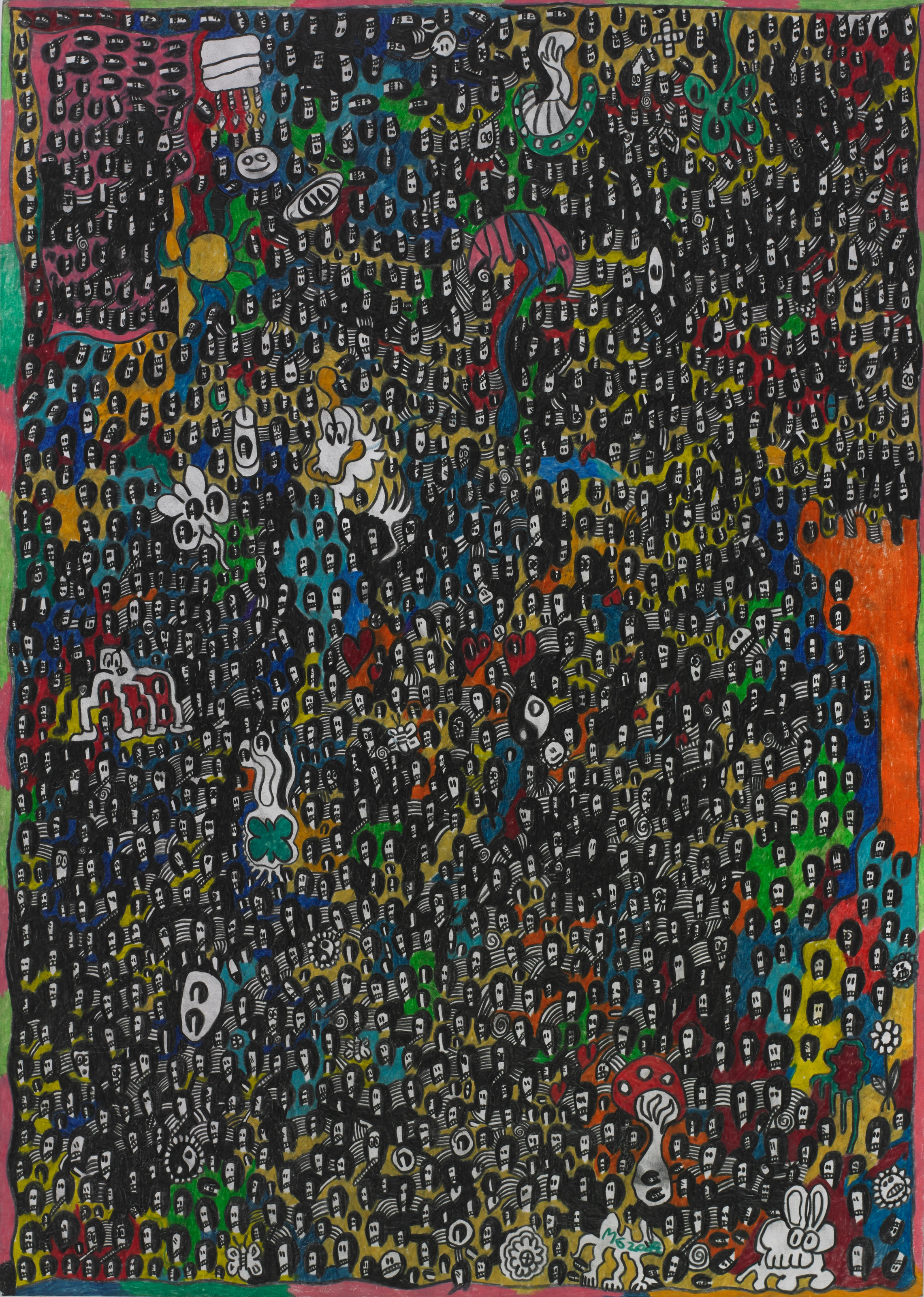 *1991Die farbintensiven Arbeiten von Manuel Griebler entstehen mit Farbstiften und entfalten eine faszinierende Bildwelt. Zahlreiche kleine Köpfe, Figuren, Regenbögen und technische Objekte verdichten sich zu komplexen Kompositionen, die einer assoziativen Logik folgen. Seine Werke laden dazu ein, in ein Geflecht aus Motiven einzutauchen, das sich zwischen spielerischer Vielfalt und präziser Ordnung bewegt.