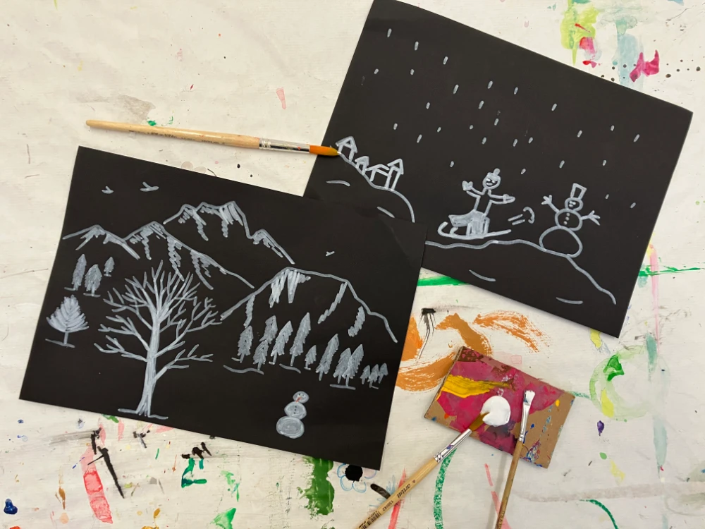 Bei diesem Eltern-Kind Workshop im neuen Jahr gestalten wir fantasievolle Winterlandschaften. Auf schwarzem Papier entstehen Winterszenen in Weiß, gezeichnet mit Stiften, Pinseln und Acrylfarbe. Kinder können verschiedene Techniken ausprobieren und erfahren, wie sich Malen und Zeichnen unterscheiden. So entstehen verspielte und abstrakte Landschaften in Weiß auf Schwarz.